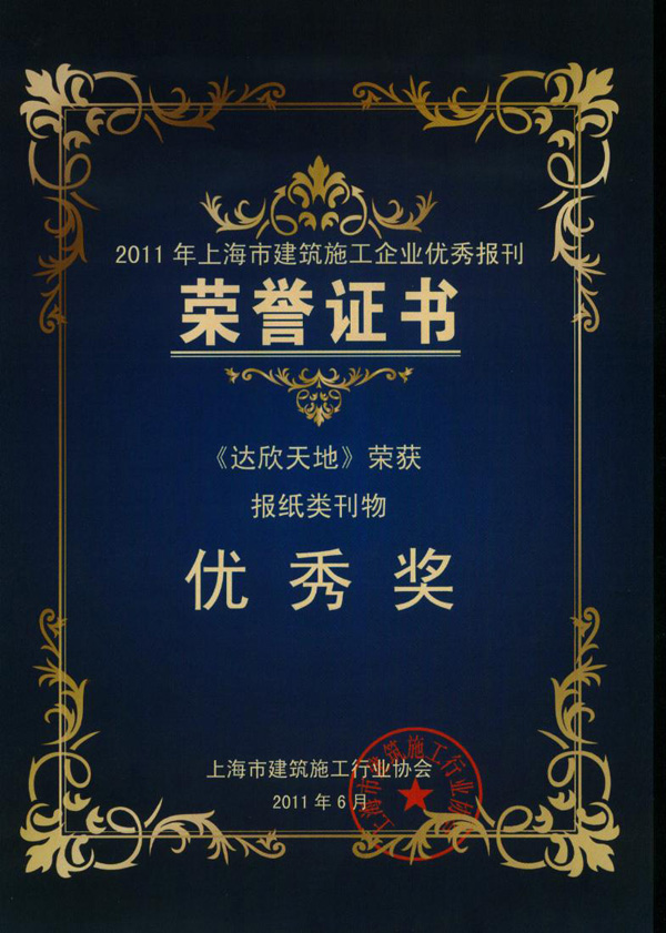 2011年上海市建筑施工企業(yè)優(yōu)秀報(bào)刊及協(xié)會(huì)優(yōu)秀通訊員表彰會(huì)日前召開,由上海市建筑施工企業(yè)優(yōu)秀報(bào)刊評(píng)委會(huì)評(píng)選,公司創(chuàng)辦的“達(dá)欣天地”報(bào)榮獲2011年上海市建筑施工企業(yè)優(yōu)秀報(bào)刊獎(jiǎng)。